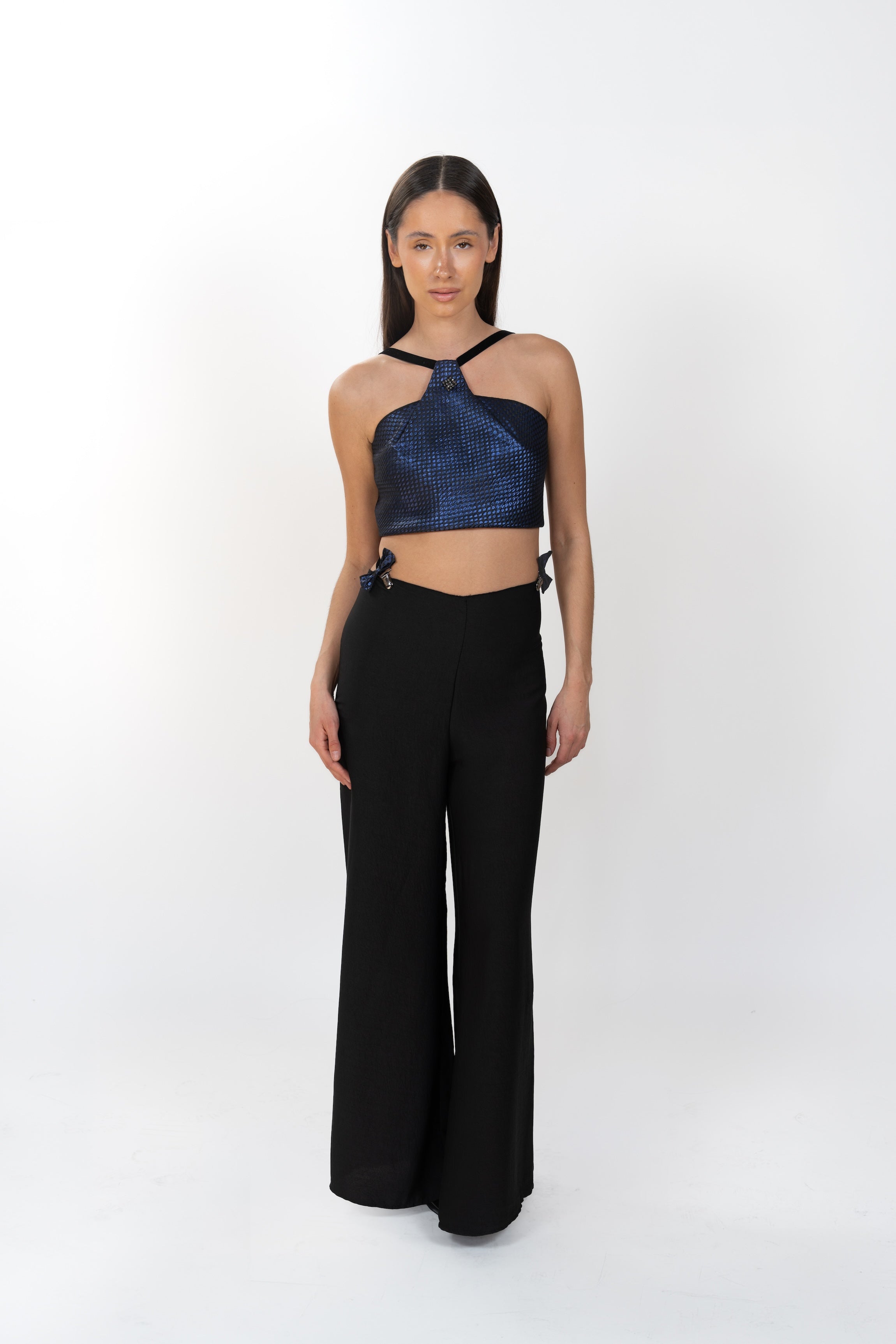 A pleated halter top in an iridescent blue textured fabrication with an open back and Bujii’s signature suspender construction.